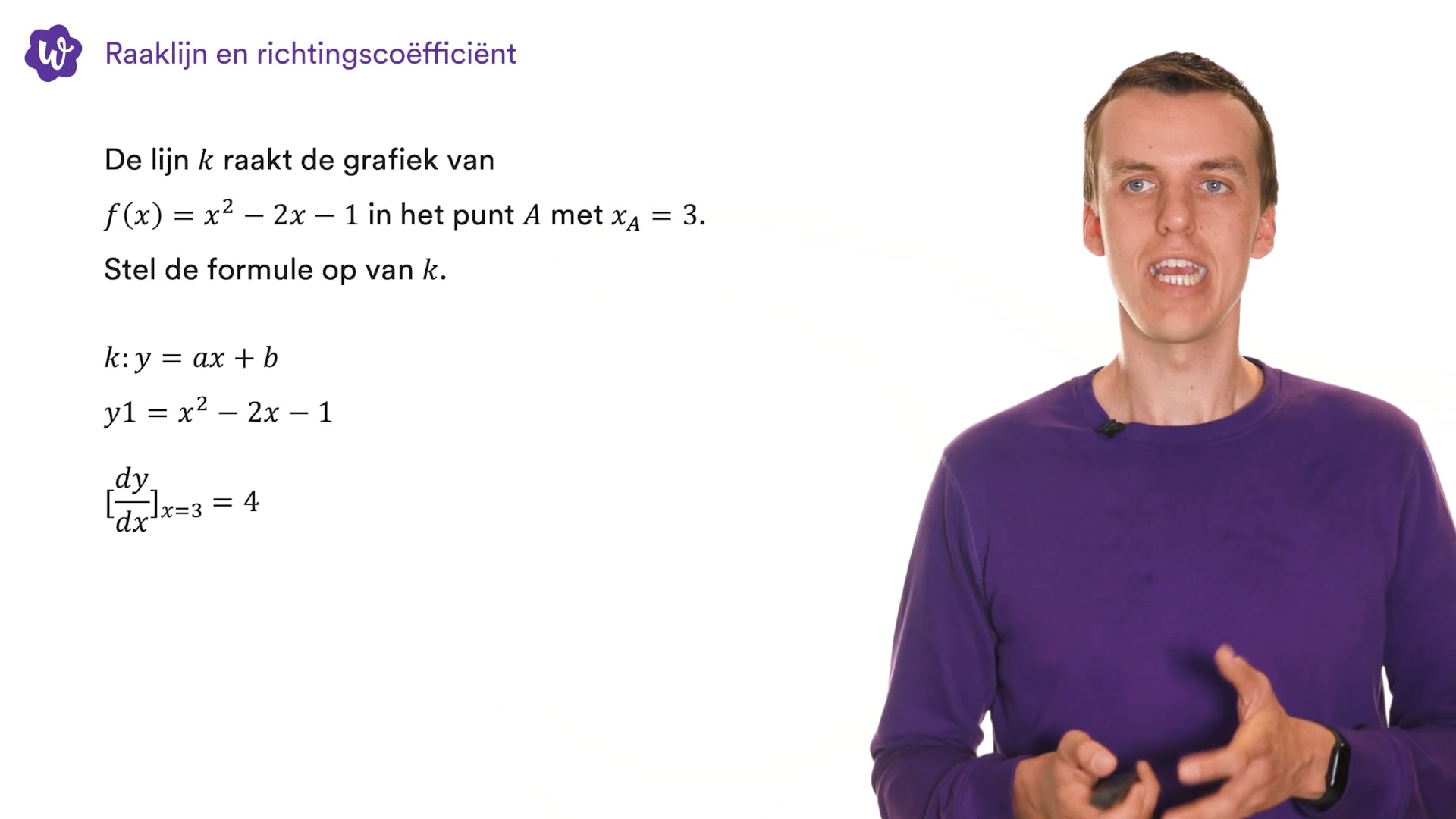 Hoe je de afgeleide berekent, kan je vinden in dit artikel. Meestal heb je een punt gegeven waarin je de afgeleide moet berekenen. Als je de x van dat punt invult in de formule van de afgeleide, krijg je de richtingscoëfficiënt (de a). Vervolgens kan je de x en de y van dat punt invullen in y = ax + b om b te bepalen. Nu weet je a en b, dus.