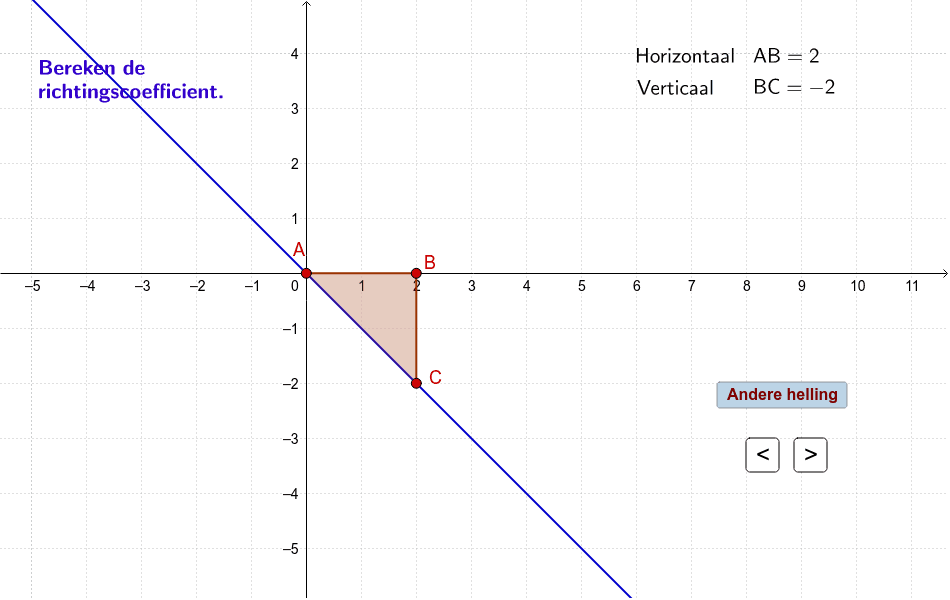 Bijvoorbeeld: Bij de gegeven functie g (x) = − 3 x + 7 g(x)=-3x+7 g (x) = − 3 x + 7 is de richtingscoëfficiënt -3 en is de grafiek een dalende lijn. Het startgetal is 7 en de grafiek gaat dus door (0,7). Ook kun je de richtingscoëfficiënt berekenen als de grafiek getekend is. Je gaat eerst op zoek naar twee mooie roosterpunten waar de.
