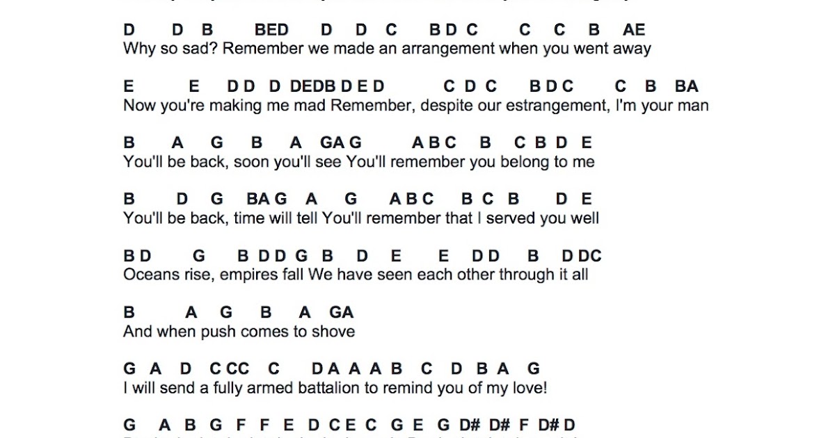 Watch: New Singing Lesson Videos Can Make Anyone A Great Singer You say The price of my love's not a price that you're willing to pay You cry In your tea which you hurl in the sea when you see me go by Why so sad? Remember we made an arrangement when you went away Now you're making me mad Remember, despite our estrangement, I'm your man You'll be back soon you'll see You'll remember you belong.