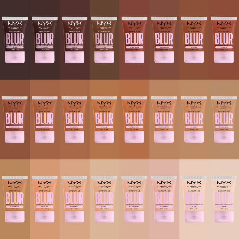 Description. Introducing the first blurring skin tint foundation, NEW NYX Bare With Me Blur Tint Foundation! In 24 buildable, medium coverage matte finish shades formulated to enhance your own skin color and tone. Formulated with Glycerin, Matcha and Niacinamide, this lightweight slip texture will leave your skin looking blurred and healthy.