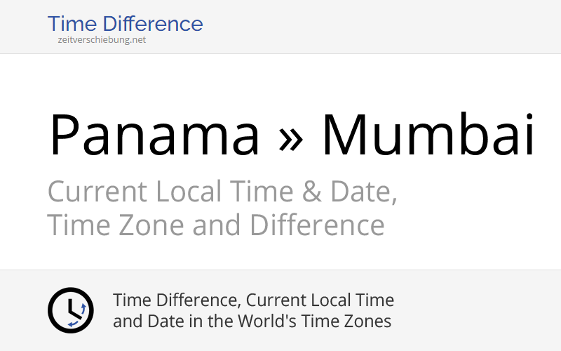 Time zone difference or offset between the local current time in Panama - Panama and India - Maharashtra - Mumbai. The numbers of hours difference between the time zones. Sign in. Home. Home Page; Newsletter; About Us;. 2023 at 6:32:22 pm EST UTC-5 hours Mumbai (India - Maharashtra) Sunday, April 30, 2023 at 5:02:22 am IST UTC+5:30.