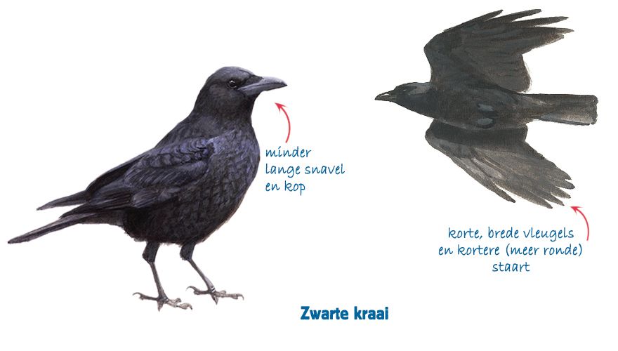 Maar om te beginnen is de zwarte kraai duidelijk kleiner dan de raaf, met kortere en bredere vleugels. Dat zie je het beste wanneer je beide soorten samen ziet, maar het verschil in grootte is opvallend. Raven zijn groter - en zwarte kraaien juist kleiner - dan een buizerd. Andere belangrijke verschillen zijn de geluiden.