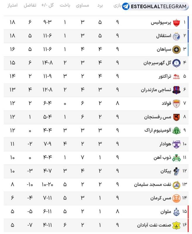 مشرق نیوز عکس/ جدول رده بندی لیگ برتر در پایان هفته نهم